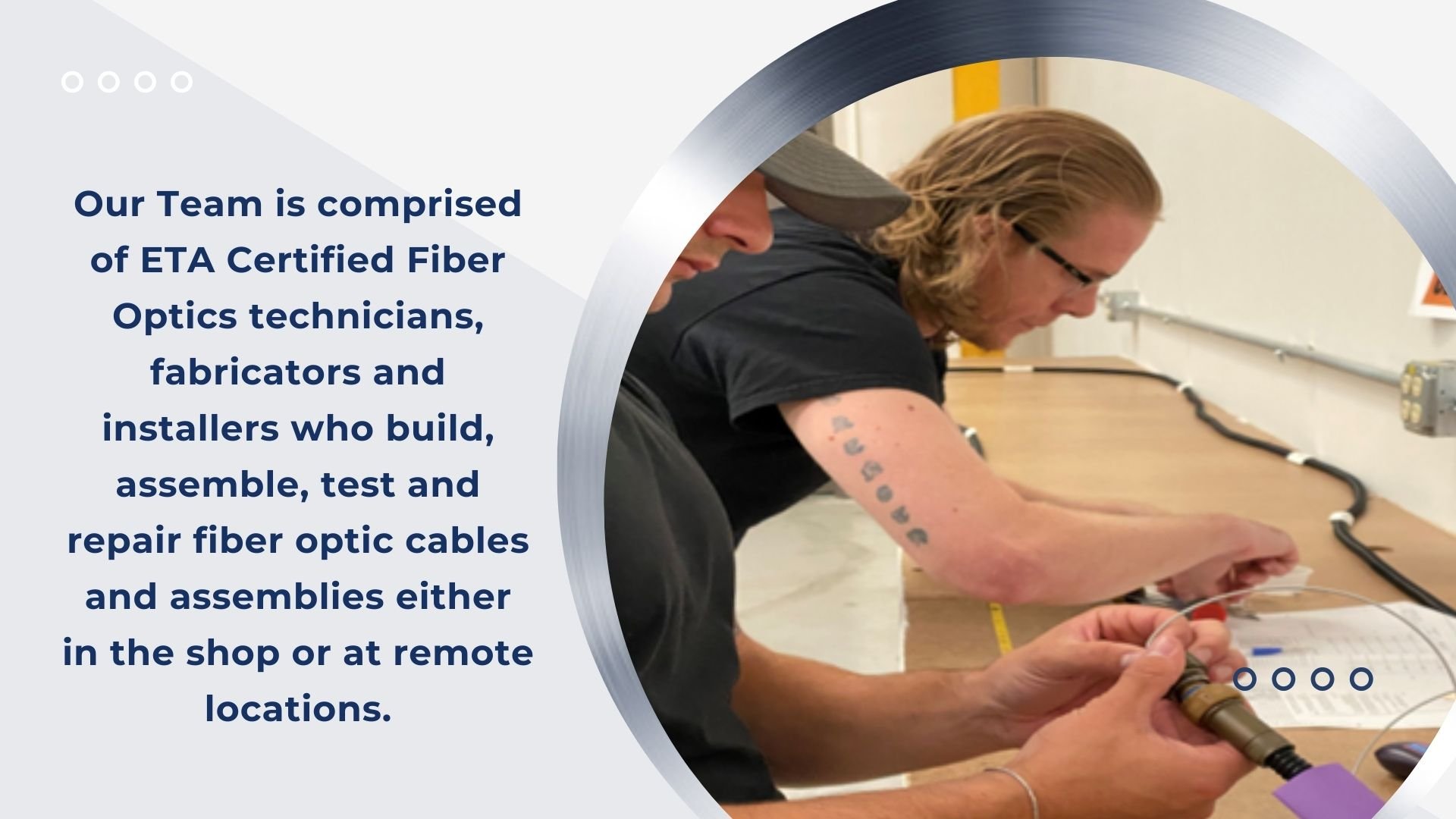 VISION MT's Fiber Optics Team are proficient in Single Mode, Multi-Mode, and Multi-Channel fiber, working with both tight and loose structures and a wide range of connectors including M38999, M28876, ARINC, ST, LC, SC, TFOCA-II, and COTS. We support aircraft and shipboard assemblies, as well as avionics and electro-mechanical systems.
