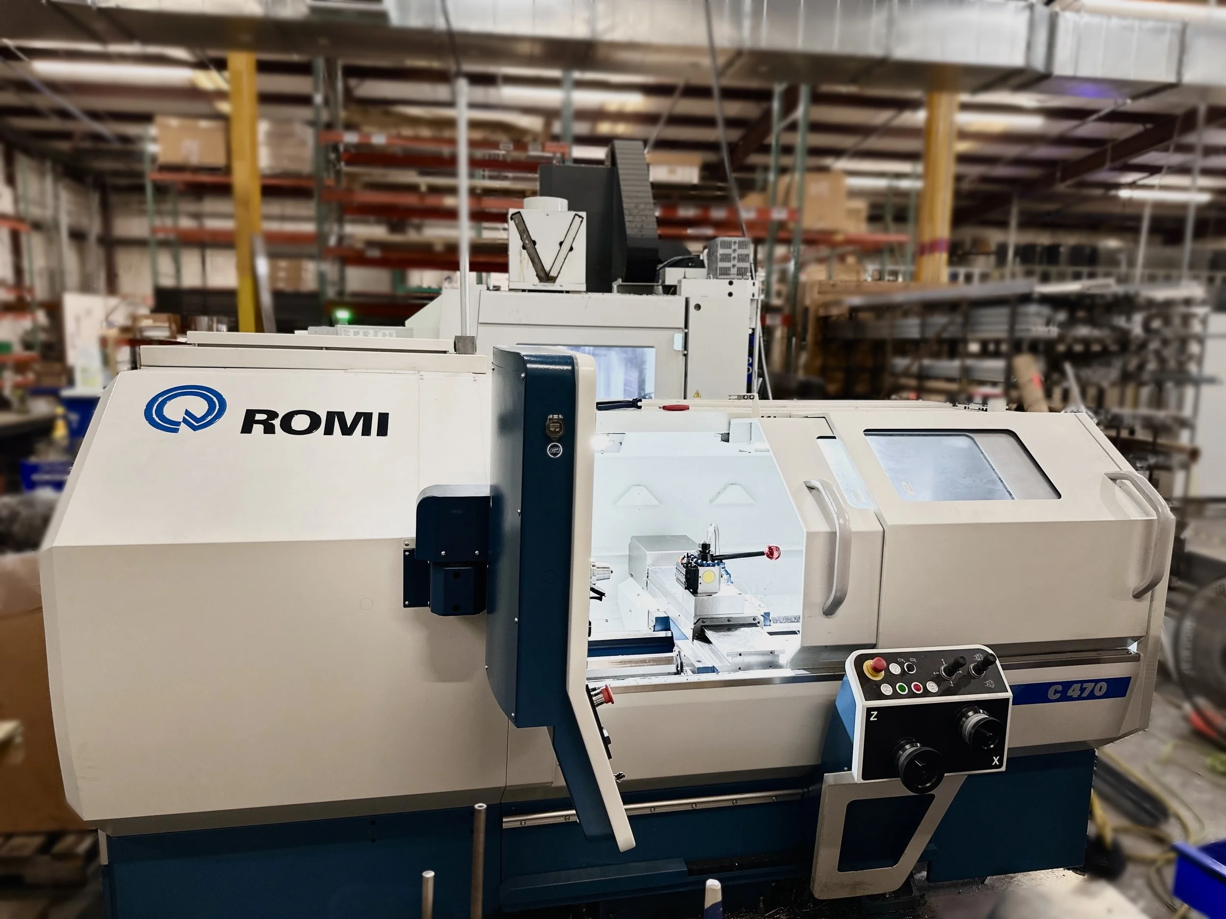 Romi / C470 Lathe - Teach CNC lathe with an 18.5" (470mm) swing over bed, a 4,000rpm 12.5 hp main motor, and 39.37" (1,000mm) between centers. It is equipped with the Romi Manual Machining Package (RMMP), which allows both manual and automated operation. Using the RMMP, an operator can machine parts manually using the handwheels or automatically using a joystick and start cycle. The operator can also fill in the fields on the CNC screen, indicating spindle speed, feeds, cutting depth, coordinates, and angles.